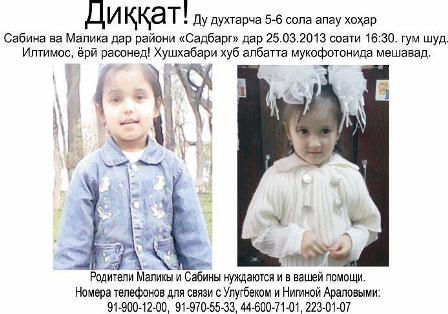 Malika and Sabina have been missing since March 25. The girls reportedly disappeared from the yard where they were playing and parents of both girls reported their missing to the police station in Dushanbe’s Shohmansour district on the same day.