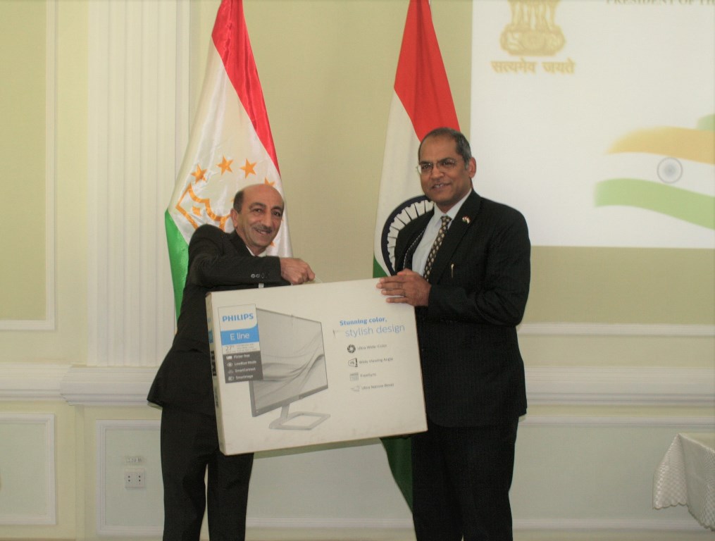 As part of India-Tajikistan bilateral cooperation and capacity building program, Ambassador of India to Tajikistan Mr. Viraj Singh today handed over technical equipment to Mr. Khurshed Ziyoi, Director of the Center for Strategic Studies under the President of Republic of Tajikistan (CSS) at a ceremony held at CSS.