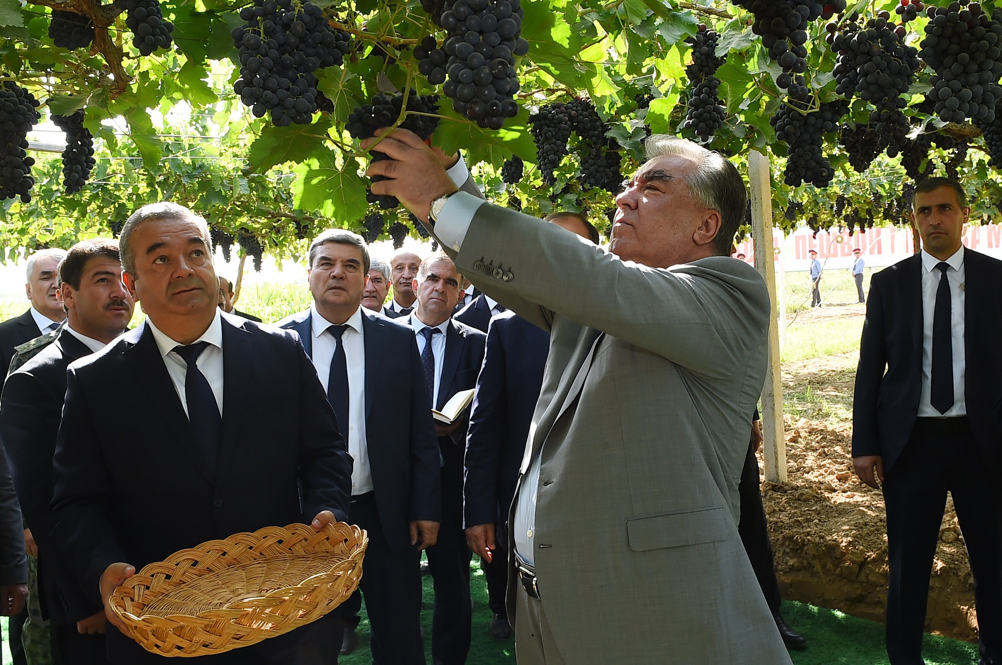After CJSC Juntai-Khatlon Sin Silu, Emomali Rahmon visited the farming unit named after Muhammad Osimi, where he gave start to the harvest of early ripening grapes.