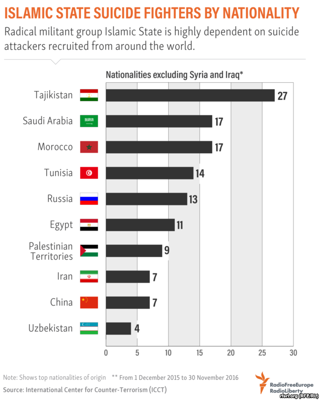 Charlie Winter, the author of the ICCT report, says Tajiks are “disproportionally represented” on the list of suicide bombers because the number of Tajiks joining IS pales in comparison to that of citizens of some other countries.  For example, 6,500 Tunisians and 2,500 Saudis are estimated to have joined IS.