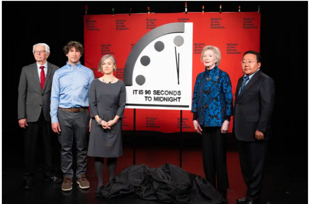 The "Doomsday Clock," created by the Bulletin of the Atomic Scientists to illustrate how close humanity has come to the end of the world, moved its "time" in 2023 to 90 seconds to midnight, 10 seconds closer than it has been for the past three years.