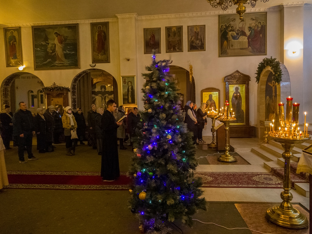 Празднование Рождества Христова в душанбинском храме проводится точно так же, как и в других православных церквях по всему миру. Ночная служба начинается в полночь и длится около трех часов.