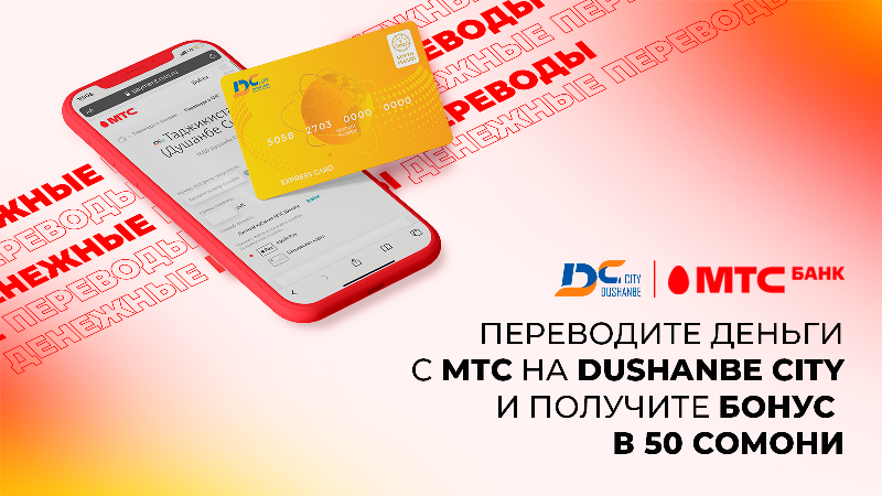 У переводов на карты Dushanbe City через сервис МТС Банк стало еще больше выгоды для вас! Кроме того, что максимально просто и быстро, можно совершать перевод в Таджикистан по номеру телефона, теперь за перевод на карту получателя возвращается 50 сомони в виде бонусов, а главное, без комиссии. Акция продлится до 31.03.2022.