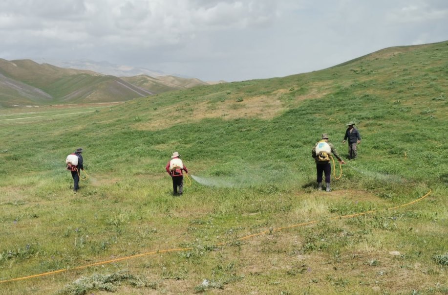Сотрудники государственных учреждений «Экспедиция борьбы против саранчи» и «Защита растений и сельскохозяйственная химизация» в настоящее время проводят по всей республике работу совместно с местными властями по борьбе против саранчи.