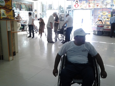 Наконец-то один из посетителей согласился, но на коляске он не смог подняться по пандусу, у которого как оказалось, отсутствуют перила и при помощи другого человека он смог подняться к входу, но там его встретило еще одно препятствие — наличие одной ступени, которую он не смог преодолеть без посторенней помощи. После первого волонтера появились еще несколько желающих, но и они не смогли самостоятельно попасть в торговый центр. Каждый делился своими впечатлениями. Каждому участнику были вручены памятные подарки, бейсболка и футболка с логотипом «Имконият».