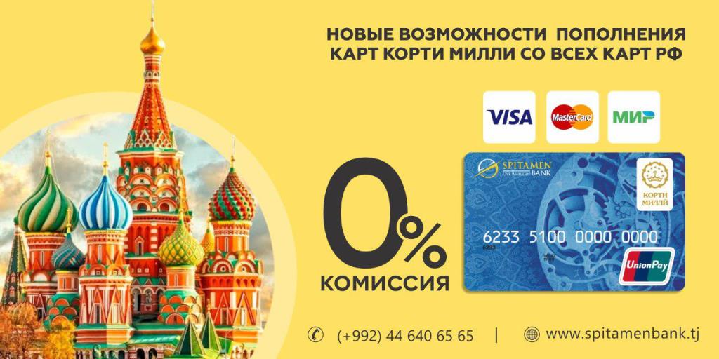 Пур кардани суратҳисоби кортҳои низоми миллии пардохтии "Корти Миллӣ"-и ҳама бонкҳо ва кортҳои низомҳои байналмилалии UnionPay ва VISA-и Спитамен Бонк, бе ҳаққи хизмат, аз кортҳои низомҳои пардохтии VISA, MasterCard ва МИР (Федератсияи Россия) имконпазир шуд.