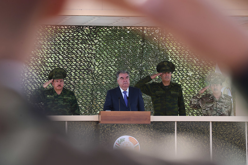 Сипас Эмомалӣ Раҳмон ба маркази баргузории чорабинӣ, ки машқҳои махсуси тактикӣ ва гузашти низомӣ пешбинӣ гардида буд, ташриф овард.