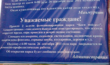 Новый душанбинский парк культуры и отдыха «Боги Пойтахт», открытый ровно месяц назад, уже как несколько дней закрыт на ремонтно-профилактические работы.
