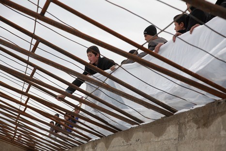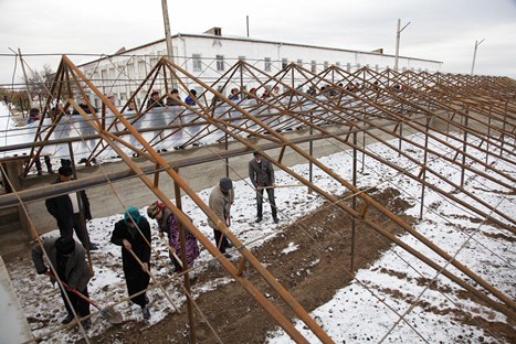 Как только мы приблизились к территории школы, то увидели, что много мальчишек и девчонок дружно работали — под руководством местного преподавателя по трудовому обучению накрывали полиэтиленовой пленкой верхнюю часть теплицы.