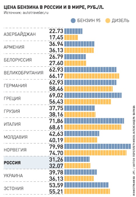 Для сравнения — в нефтедобывающей Норвегии литр Аи-95 стоит 80 рублей, в Италии — 72 рубля, в Австрии — 57 рублей, в Бельгии — 68 рублей, в Люксембурге — 55 рублей, в Нидерландах — 74 рубля.