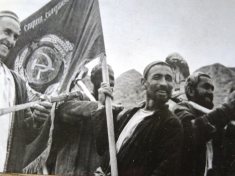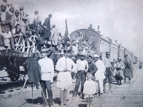 В 1926 году Совет труда и обороны принял решение о постройке железной дороги Термез–Душанбе. 15 октября 1929 г. ко дню открытия Чрезвычайного съезда Советов Таджикистана в столицу прибывает первый поезд. На помощь строителям из РСФСР были посланы в Таджикистан молодые инженеры-строители, железнодорожники. Заводы Сибири посылали шпалы, из Украины и центра России шли рельсы и другие строительные материалы. Фотография тех незабываемых дней.