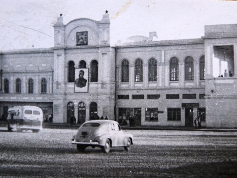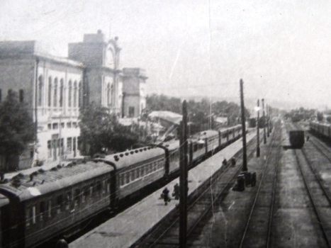 Конец сороковых. Построенное в октябре 1936 года здание вокзала имело свою интересную особенность: он был ассиметричным. Хотя его корпус был выдержан в едином стиле, он состоял из разных архитектурных элементов, что само по себе удивительно. К сожалению, к началу 60-х годов здание снесли…