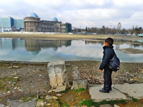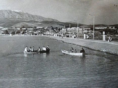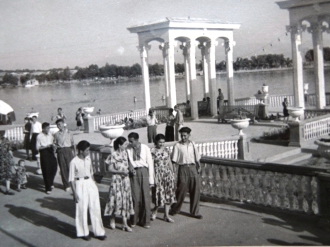 Сталинабад, 1940 год. Прекрасное голубое озеро раскинулось в пойме реки Душанбинка. В 1938 году, когда было закончено строительство широкого железобетонного моста через Душанбинку, по инициативе комсомольцев Сталинабада и силами его жителей в 1939-м году было сооружено Комсомольское озеро и рядом разбит большой тенистый парк с античными вазами и освещением по всему периметру. Для сталинабадцев озеро сразу стало самым любимым местом семейного отдыха и досуга…