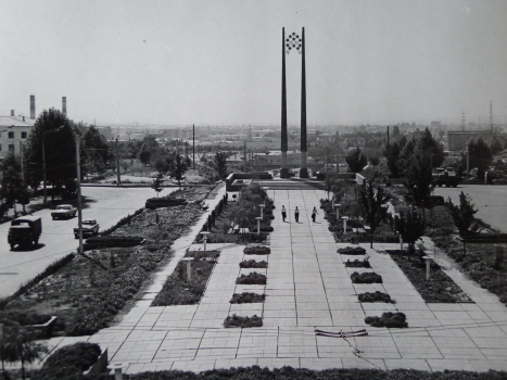 1971 год. Мало кто знает, что здесь, на площади Победы, в конце 40-х годов находилась свалка металлолома. К ней, на теперешней площади, вела ж/д ветка, и многие из старожилов помнят, как на этой площади разгружали десятки сгоревших немецких танков. Сейчас здесь монумент с установленным позднее легендарным танком «Иосиф Сталин–2». Он был посвящен памяти создания танковой колонны «Комсомолец Таджикистана» во время Великой Отечественной войны. Золотистые звезды на его двух вершинах символизировали братство и нерушимую дружбу 15-ти союзных республик. Но странным образом в 1985 году сразу после прихода к власти М.С. Горбачева звезды исчезли, а через несколько лет, исчез Советский Союз…