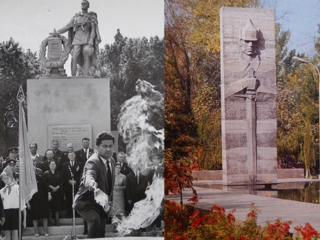 В 60-е годы прошлого века в городском парке им. Ленина был открыт памятник борцам за установление Советской власти в Таджикистане (слева). Но историки сразу увидели следующую несуразицу: красноармеец был одет в форму солдата Великой Отечественной войны, да еще с автоматом Судаева в руках. «Хотели, как лучше, а получилось, как всегда». Поэтому в 1971 году памятник демонтировали и установили другой, более соответствующий тому времени (справа).