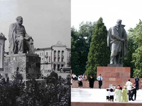 В 50-е годы в Сталинабаде установили памятник таджикскому советскому писателю, общественному деятелю и учёному, лауреату Сталинской премии 1950 года Садриддину Айни (слева). Позже, в 70-годы, этот памятник был демонтирован, и на площади был установлен новый (справа).