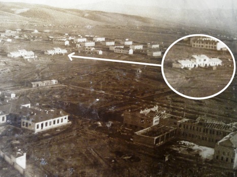 Сталинабад, 1932 год. Стандартный городок, первый жилой микрорайон Душанбе. А один домик сохранился до наших дней (отмечен стрелкой). Сейчас он стоит напротив здания «Фононбанка» по ул. М. Турсунзаде. А на переднем плане (в нижнем правом углу фотографии) видно строительство школы №1.