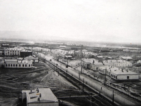 1938 год. На фото – улица Т. Шевченко (позднее — Ф. Дзержинского). Снимок сделан с крыши западного крыла Главпочтамта. Сейчас с правой стороны дороги расположено здание МВД РТ, а с левой — КНБ РТ. В том же году, 3 марта 1938 года, Совнарком Таджикской ССР утвердил первый генеральный план города Сталинабад. (Архитекторы — М. Баранов и др. Гипрогор, Ленинград).
