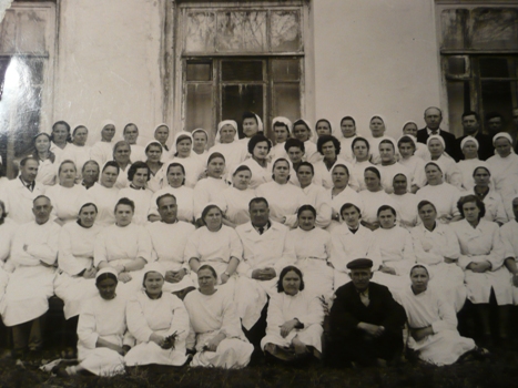 1945 год. На снимке персонал сталинабадского сортировочного госпиталя №4444. Им приходилось первыми принимать раненых солдат и офицеров Красной Армии с санитарных поездов, определять характер ранений, проводить срочные хирургические операции, направлять и развозить раненых по специализированым госпиталям.