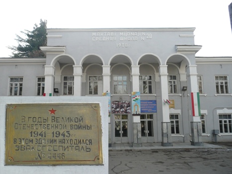 В числе сталинабадских эвакогоспиталей была и школа №20, и, благодаря мемориальной доске, ее нынешние ученики знают, что в этом здании когда-то размещался эвакогоспиталь № 4446. Отрадно то, что до сих пор в школе существует музей, посвященный погибшим на фронтах войны ее учителям и бывшим ученикам — символ связи и отношения нынешнего поколения к памяти о героях Великой Отечественной войны.