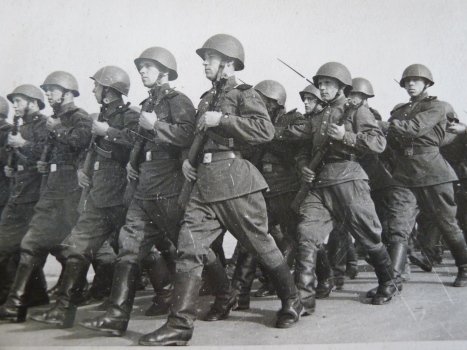Курсанты одесского артиллерийского училища маршируют по Площади связи 9 мая 1945 года.