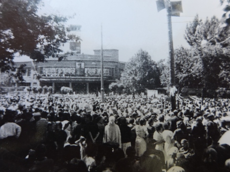 В половине второго дня на центральной площади Сталинабада (центральной в то время была Площадь связи) собралось около 50 тысяч сталинабадцев. Начался митинг. Выступали секретарь горкома партии Штатнов, секретарь ЦК КП (б) Таджикской ССР Протопопов, представители рабочего класса, крестьянства и интеллигенции. Все отмечали, какой ценой досталась победа, каким количеством жертв. Благодарили воинов Красной Армии и тружеников тыла. Вспоминали погибших в боях и замученных в концлагерях. Говорили о предстоящем восстановлении страны. Но, несмотря на горечь утрат, чувство радости переполняло сердца людей. Выступали многие, всем хотелось выразить свои чувства.