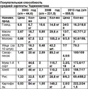 Сравнение 2008 и нынешнего года показывает, что покупательная способность зарплаты объемом 555,5 сомони «выросла» к началу 2013 года в 2,4 раза. Между тем в расчете на продукты это означает прибавку всего лишь на 1,5кг говядины, 3 литра масла или 10кг сахара. Значительный рост цен (например, на мясо, масло, молоко и сахар — почти вдвое, в полтора раза на муку и хлеб) практически «съел» прибавку к зарплате.