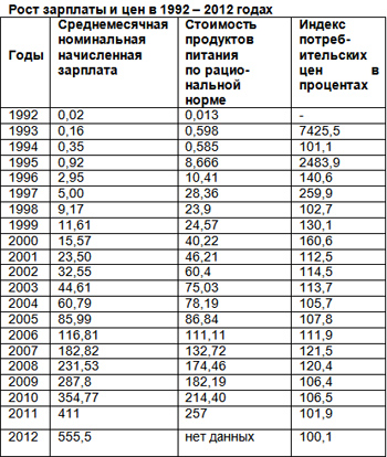 Официальные данные по росту среднемесячной зарплаты за 1992 – 2010 годы приведены в таблице, расположенной ниже, в которой показаны по годам среднемесячная зарплата, стоимость продуктов, достаточных для полноценного питания, и рост цен.