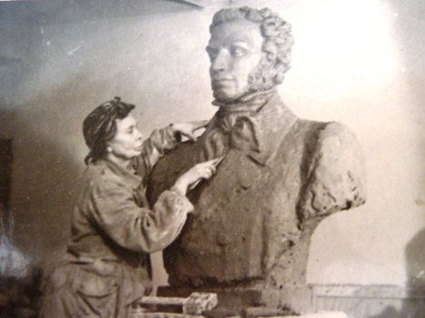 Март 1953 года. На снимке: скульптор Е.А.Татаринова работает над бюстом великого русского поэта А.С.Пушкина, впоследствии установленного на центральном фасаде здания библиотеки им. Фирдавси в г. Душанбе.