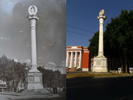 60-е годы прошлого века. На снимке: один из четырех фонтанчиков на площади перед Государственным Академическим театром оперы и балета им. С.Айни со стилизованными театральными масками и богато декорированной вазой, выполненной заслуженным деятелем искусств Таджикской ССР скульптором Еленой Татариновой. Печально, что совсем недавно они были демонтированы, и судьба их неизвестна.