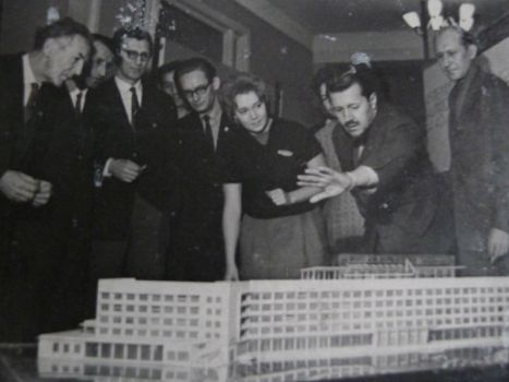 На снимке: г. Душанбе, 1961 год. Справа — архитектор Снеговский, главный архитектор города Душанбе в начале 60-х годов; рядом с ним Всеволод Глебович Веселовский — автор первого генплана Ленинабада, в 60-70 годы председатель Союза архитекторов Таджикистана представляет молодым архитекторам города макет новой гостиницы «Душанбе».