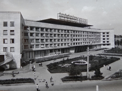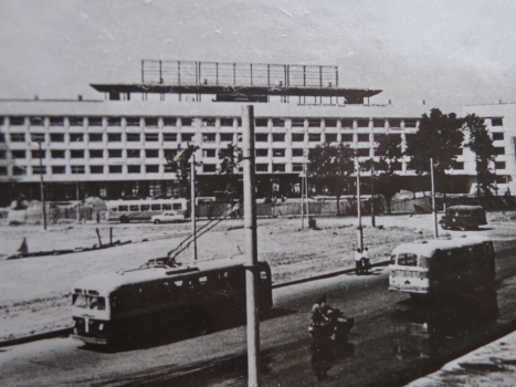 Душанбе, весна 1964 года. К 40-летию республики в столице заканчивается строительство первого шестиэтажного здания в городе — новой гостиницы «Душанбе». Архитекторы Г.Айзикович, В.Шелухин, инженеры Г. Лазарев, В.Гроссвенд. (1961-1964 гг.)