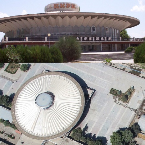 Душанбе, 2013 год. Цирк. «Веерообразный складчатый диск на стилобате перерастает в увлекательный аттракцион. Кажется, что здание вот-вот закружится на центрированном постаменте. И это кручение деловито подчеркнуто теневыми эффектами складок, скользящими вслед за солнцем. И тонкими средниками окон над низким параллелепипедом стилобата». Статья из журнала «Архитектура в СССР» о душанбинском цирке. Проект «Гипротеатра». Переработка «Таджикгипростроя». Архитекторы Г. Айзикович, Т. Вольвак, Э. Ерзовский. 1978 год.