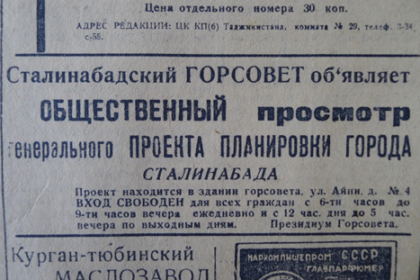 1938 год. Объявление в газете «Коммунист Таджикистана» об общественном просмотре генплана города Сталинабад, разработанного группой лучших ленинградских архитекторов под руководством Николая Баранова.