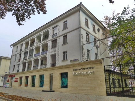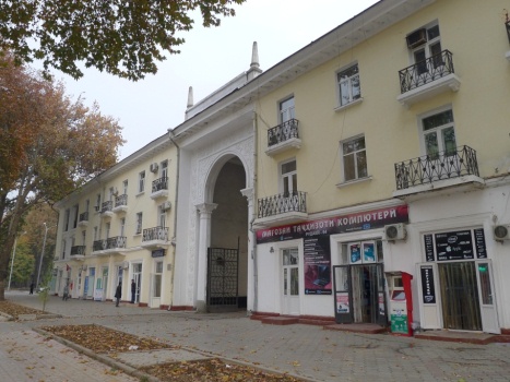 Душанбе, 2013 год. Жилой комплекс, построенный по проекту архитектора Николая Баранова в 1950-1954 годах на пр. Ленина. Архитектор сумел создать ансамбль с учетом хорошего восприятия с различных точек обзора, приняв за основу трехчастную композицию с четырехэтажным корпусом в центре и двумя боковыми трехэтажными. А замечательные стрельчатые арки, где ворота с чугунными решетками, выполненные в типично петербургском стиле, придают зданиям классический вид, апеллируя к «золотому веку» зодчества столицы на Неве.