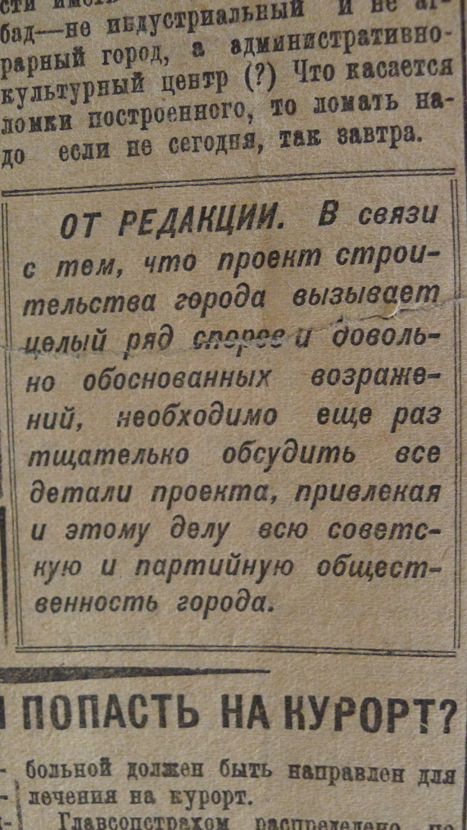 Вырезка из газеты «Коммунист Таджикистана» за 1938 год. Как видно из текста объявления, уже тогда шли горячие споры и дебаты о будущем архитектуры нашего любимого города. И все это делалось гласно и широко освещалось в печати того времени.