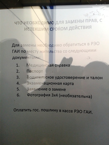 МЕЖДУ ТЕМ мы решили попробовать обменять водительские права, время выдачи которых превышает десять лет. Для замены удостоверения необходимы: заявление установленного образца, паспорт, медицинская справка, экзаменационная карта (документ о прохождении обучения ранее), старое водительское удостоверение и талон, фотография 3х4.