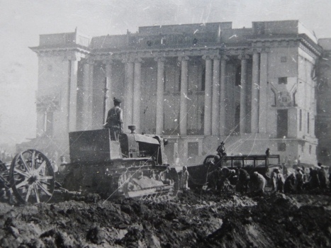 Сталинабад (Душанбе), 6 сентября 1947 года. Грейдер планировщик задне — прицепной разравнивает грунт на площади перед театром.