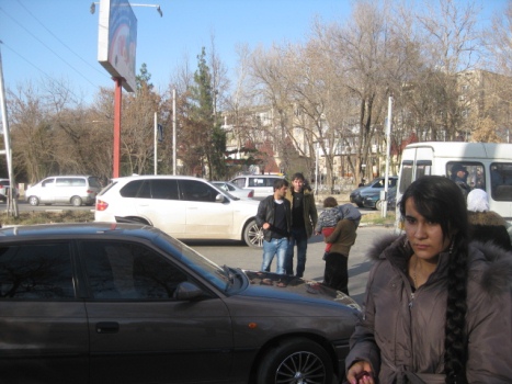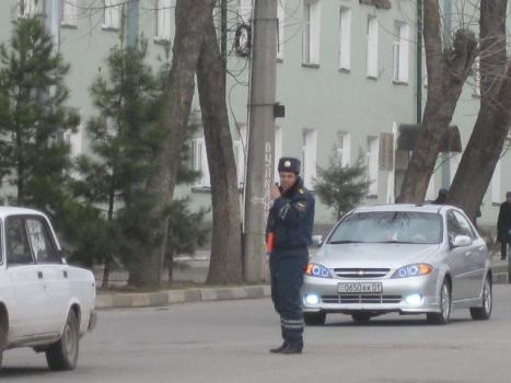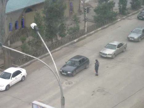 Пересечение улиц Турсун-заде и Ниязи, 24 января 2014 года. Инспектор ДПС простоял здесь не долго. Он не смог в полной мере регулировать движение автотранспорта, устал или надоело ему это занятие, и он покинул свой пост…
