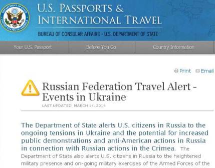 Государственный департамент США предупреждает граждан Америки о потенциальном увеличении публичных демонстраций и антиамериканских акций в Российской Федерации в связи с действиями России в Крыму. Предупреждение
