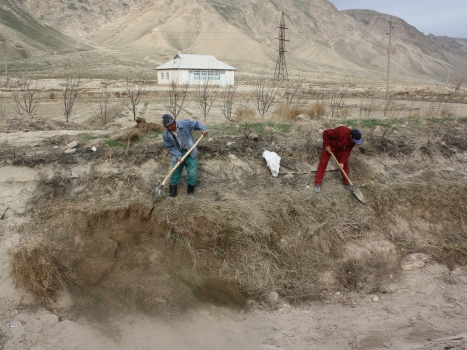 На следующий день дехканские хозяйства провели хашар по очистке канала и установке шлюзов (ворот). Приехали и специалисты USAID. Члены дехканских хозяйств очищали от ила дно канала, сжигали засохшие колючки…