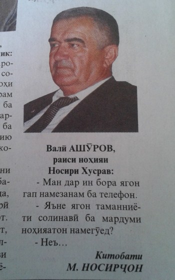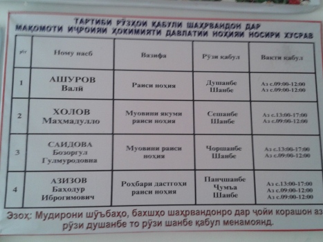 Приемная В. Ашурова вообще была закрыта. У входа в здание администрации района молодой человек пояснил, «что из-за того, что приехал журналист из Душанбе, В.Ашуров дал указание всем работать вне здания администрации».