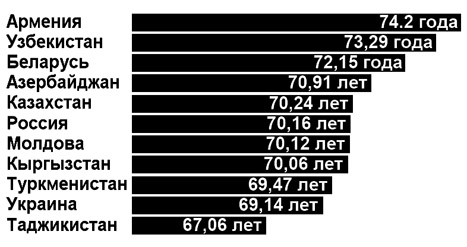 Так, 9 лет назад граждане соседнего Узбекистана в среднем жили ровно 64 года, в Кыргызстане — чуть больше 63, а в Казахстане и того меньше. Сегодняшняя картина совсем другая: если у нас 67, то в Узбекистане — свыше 73, в Казахстане и Кыргызстане — больше 70.