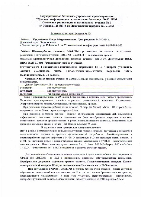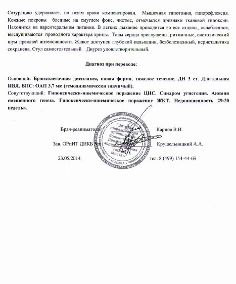 Ребенок — Ноида, 1 месяц. Диагноз — порок сердца это основной. Бронхолегочная дисплазия, тяжелое лечение, ДН 3 ст. Длительная ИВЛ. ВПС: ОАП 3,7 мм.