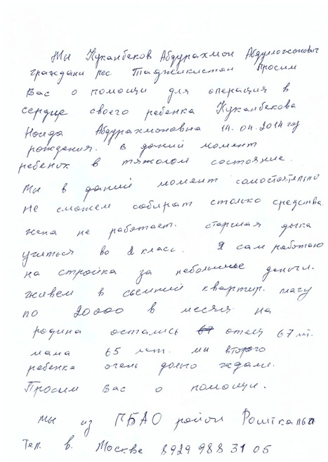 В фонд обратились врачи из Научного центра здоровья детей РАМН с просьбой оплатить операцию на сердце для Ноиды, они просто не могут отправить малышку домой умирать, потому что у ее родителей нет денег. А мы очень просим вас всех помочь девочке спасти жизнь, и это очень срочно.