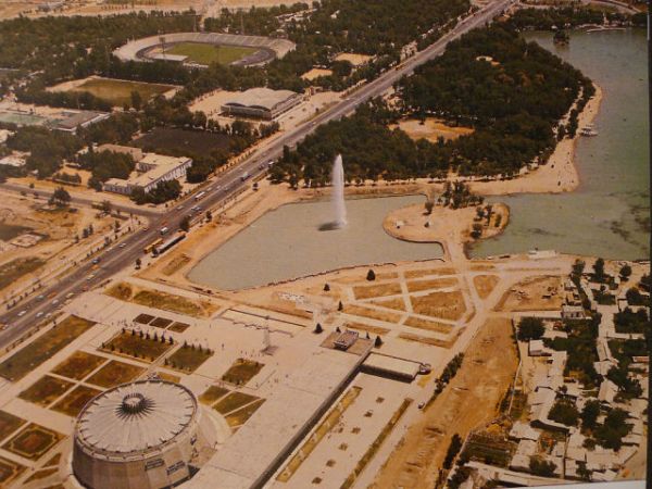 Фото 5. Душанбе, 1988 год. На снимке: Киноконцертный зал, парк у Комсомольского (Молодежное) озера, стадион имени М.В.Фрунзе и др. строения. Сейчас ландшафт вокруг озера изменился полностью.