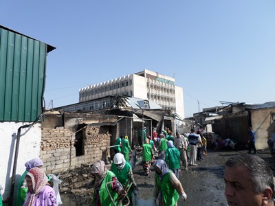 Минимум 1000 человек во главе с мэром Куляба Абдугаффором Рахмоновым вышли сегодня на субботник на пепелище сгоревшего накануне рынка в центре города.