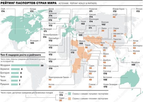 , визовые ограничения отражают статус страны на международной арене, убеждены авторы рейтинга: последние позиции занимают наименее благополучные страны — Афганистан, Ирак и Сомали. Россия за четыре года поднялась в рейтинге с 49-го на 38-е место.