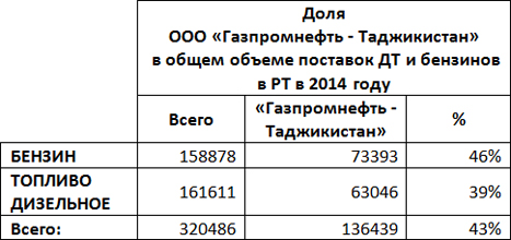 Представители Антимонопольной службы при правительстве РТ заявляют о беспочвенности таких заявлений. По их данным, за семь месяцев нынешнего года в Таджикистан поступило свыше 350,2 тыс. тонн нефтепродуктов, из которых больше 168,4 тыс. тонн — бензина. На долю «Газпромнефти» пришлось менее 43%.