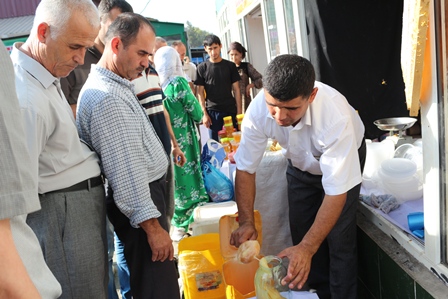 Мы побывали на рынке «Шохмансур» и ознакомились с ценами на представленную на ярмарку продукцию. Так, стоимость дыни колеблется от 5 до 12 сомони в зависимости от веса. Цена меда — от 20 до 45 сомони за килограмм.